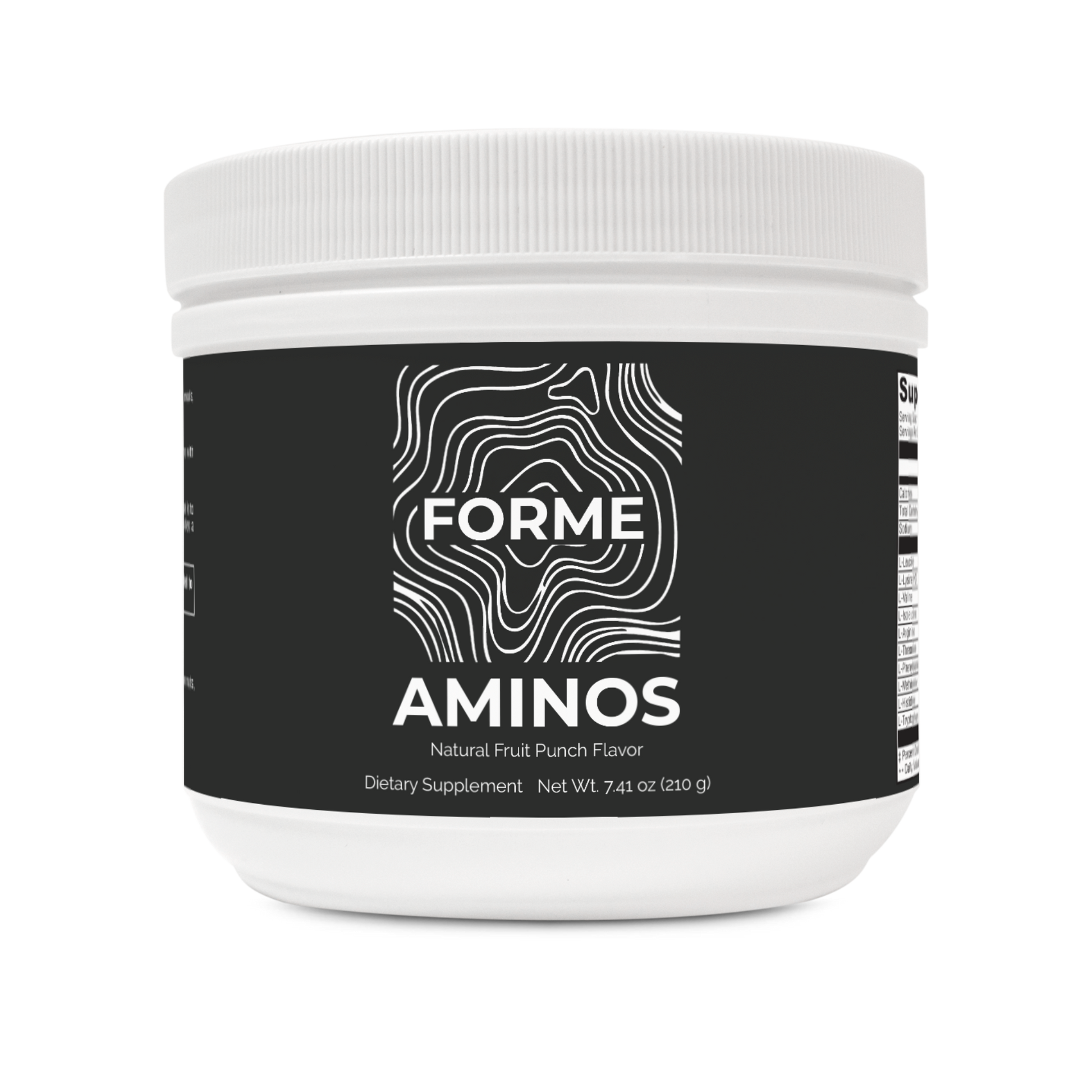 FORME AMINOS is a clean, carb-free supplement featuring naturally sourced electrolytes and a complete profile of branched-chain amino acids (BCAAs) to support hydration, recovery, and muscle health.